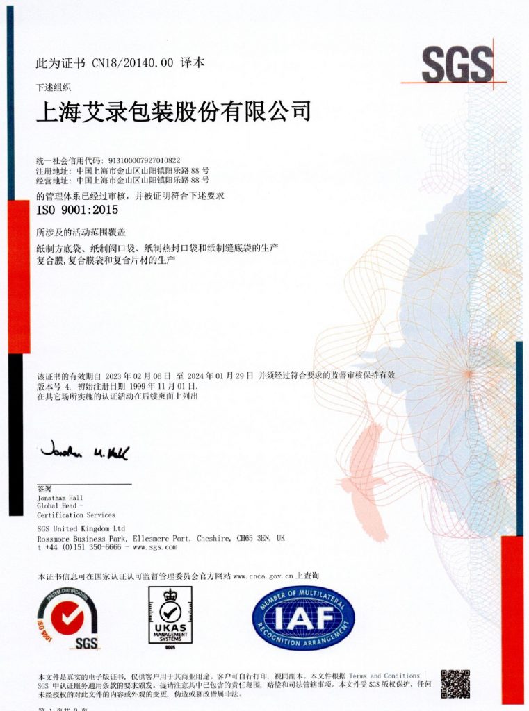 上海艾錄包裝股份有限公司(證券簡稱:上海艾錄 證券代碼:301062)成立于2006年,主要從事工業用紙包裝、塑料包裝及智能包裝系統的研發、設計、生產、銷售以及服務。經過多年的持續發展,公司已由國內領先的工業用紙包裝公司,成長為一家工業與消費包裝產品皆備的軟體包裝一體化解決方案提供商,并通過智能化、柔性化、定制化的生產能力,為妙可藍多、蒙牛、光明、雀巢、菲仕蘭、 陶氏、巴斯夫、沈陽化工、佰利聯、德高、立邦、東方雨虹、美巢等國內外知名工業及消費類企業客戶提供包裝解決方案所需的相關產品。
